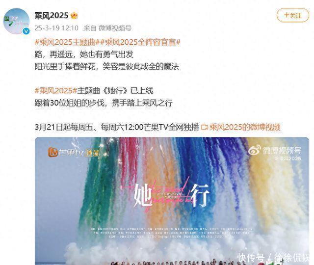 节目组官博发布《她行》主题曲写道:“跟着30位姐姐的步伐,携手踏上乘风之行。3月21日起每周五、每周六12:00芒果TV全网独播。”